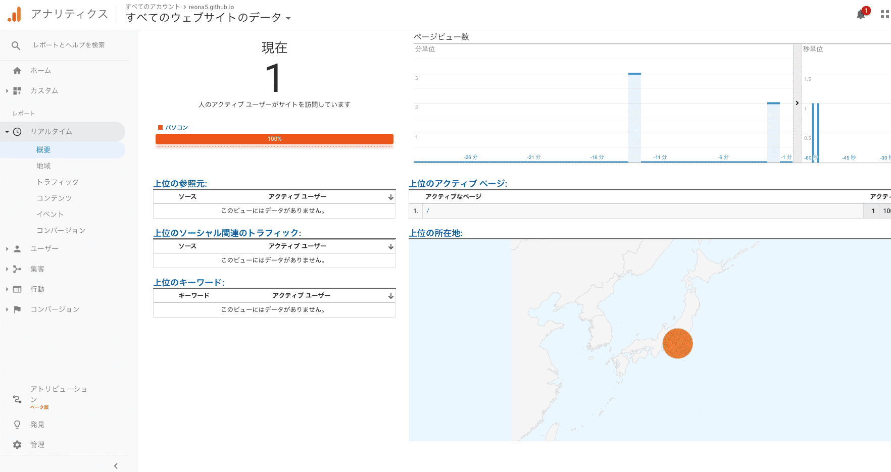 これで設定完了です。トップページにアクセスして、Google Analytics のリアルタイムアクティブユーザーに反映されていれば成功です。