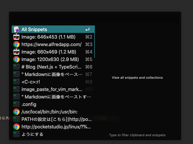 これで Vim でもブログに画像を展開する際は非常にスムーズに行なえるようになりました。 普段Alfredのクリップボード機能にはかなりお世話になっているのですが、履歴の一番手前に貼りたい画像を持ってくれば過去の画像も問題なく展開できます。